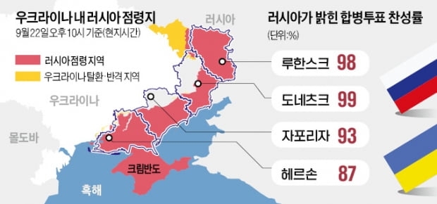 이날 러시아는 우크라이나 내 점령지 네 곳에서 진행한 러시아 편입 찬반 주민투표에서 압도적인 찬성표가 나왔다고 발표했다. 타스통신 등 러시아 언론에 따르면 러시아가 점령한 도네츠크·루한스크·자포리자·헤르손주 등 4개 지역에서 찬성률은 87~99%다. 러시아는 영토 합병 작업에 속도를 낼 계획이다. 러시아 현지 언론은 러시아가 이들 지역을 2014년 합병한 크림반도와 합쳐 '크림 연방관구'를 만들 계획이라고 보도했다.