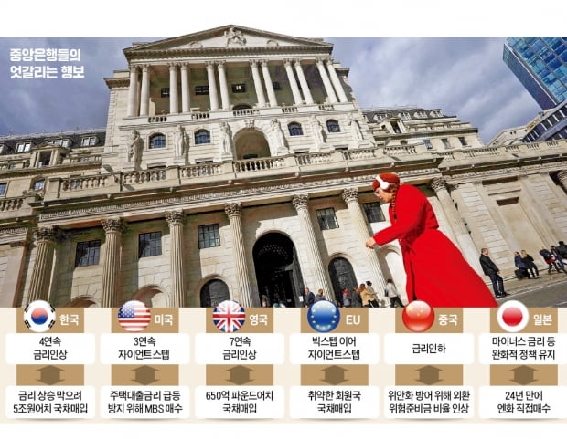 영국 중앙은행(BOE)도 이날 정부 감세 정책으로 혼란에 빠진 금융시장을 안정시키기 위해 장기 국채를 사들이기로 했다. 앞서 지난 7월 유럽중앙은행(ECB)은 기준금리를 계속 올리면서도 리스크가 커질 위험이 있는 회원국의 국채를 사주기로 했다. 변속보호기구(TPI)를 신설해 국채금리가 폭등하는 국가의 채권을 매입해주는 형태다.