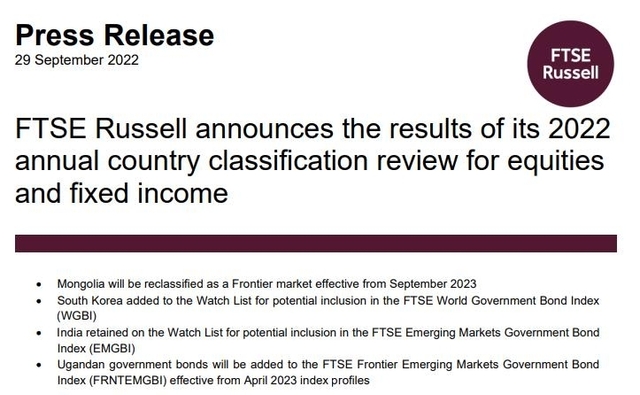 WGBI를 관리하는 FTSE 러셀은 29일(현지시간) 배포한 보도자료에서 "한국 당국이 시장 구조와 한국 자본 시장 접근성을 개선하기 위해 제안한 여러 이니셔티브를 발표한 데 따른 것"이라고 설명했다.