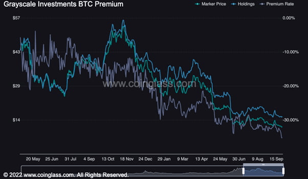 비트코인의 약세가 이어지면서 그레이스케일 투자자들의 상황도 악화되고 있다. 작년 초부터 비트코인 기초 자산보다 할인된 가격으로 거래되고 있는 그레이스케일 비트코인 트러스트(GBC)는 이번주 36%까지 급락하면서 사상 최저치를 기록했다. 그레이스케일의 GBTC의 비트코인 현물 ETF 전환이 여러차례 미국 증권거래위원회(SEC)에 의해 반려되면서 상황을 반전시키기는 더욱 어려워지고 있다. 그레이스케일 투자자 물량마저 매도 압력으로 다가온다면 비트코인의 급락으로 이어질 수 있다.