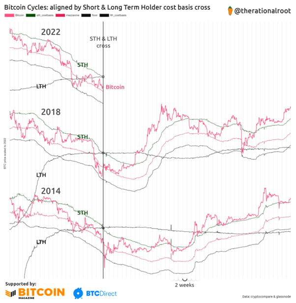 몇 주간 흔들리는 장세에서도 온체인 메트릭 상에서는 여전히 바닥 형성에 대한 신호를 보여주고 있다. 역사적인 데이터로 볼 때, 단기보유자와 장기보유자의 원가가 크로스를 하면서 장기적인 시장 반등이 나왔었다. 크로스 이후에도 급락이 나오기도 했지만 빠르게 이를 봉합하면서 새로운 고점을 형성했던 차트가 있었기 때문에 올 연말 안으로 횡보권이 끝나고 장세가 점진적으로 반전할 것이라는 해석이 지지를 받고 있다. 실제로 미국의 유명 암호화폐 저널리스트들 대부분이 지금의 비트코인 가격을 바닥으로 보면서 '바이더 딥(Buy the dip)'을 외치는 이유이다.