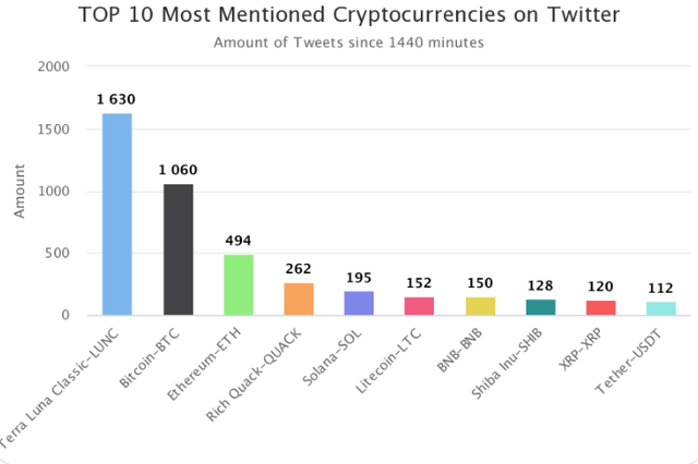 4위~10위에는 리치 쿼크(QUACK, 262회), 솔라나(SOL, 195회), 라이트코인(LTC, 152회), 바이낸스코인(BNB, 150회), 시바이누(SHIB, 128회), 리플(XRP, 120회), 테더(USDT, 112회) 등이 이름을 올렸다.