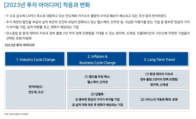 그는 "2023년에는 경기 및 기업 실적 악화를 주가가 선반영해 실적 턴어라운드가 예상되는 업종에 주목해야 한다"며 "높은 주가수익률을 기대할 수 있는 딥밸류(초저평가 주식) 기업에 대한 관심도 높아질 것"이라고 전망했다. NH투자증권이 선정한 실적 턴어라운드가 기대되는 업종은 △반도체 △조선업이다.