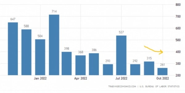 미 고용 시장은 Fed 기대와 달리 여전히 탄탄한 모습을 보여왔다. 10월 기준 비농업 일자리 수는 시장 전망(20만 개 증가)보다 많은 26만1000개 늘어났다. 실업률은 3.7%로, 전달(3.5%) 대비 0.2%포인트 높아지는 데 그쳤다. Fed는 그동안 "7% 넘는 높은 인플레이션을 잡기 위해선 고용 시장 둔화가 필요하다"고 수 차례 강조해왔다.