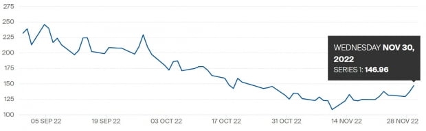 유럽의 상황은 정반대다. 이날 런던ICE거래소에서 유럽 천연가스 기준물인 네덜란드 TTF 가스 선물(2월물)의 MWh당 가격은 전일보다 7.36% 오른 146.96유로를 기록했다. 지난달 11일 108유로까지 떨어졌던 가격이 상승세다.