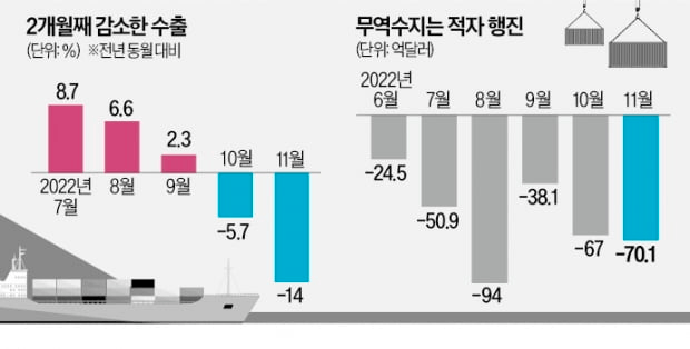 지난달 수출이 1년 전보다 14% 급감했다. 10월(-5.7%)에 이어 두 달 연속 뒷걸음질쳤다. 한국 경제의 버팀목 역할을 하는 수출이 감소하면서 실물 경기 하강이 본격화했다는 분석이 나온다. 무역수지는 국제통화기금(IMF) 외환위기 직전인 1997년 이후 25년 만에 처음으로 8개월 연속 적자가 이어졌다.