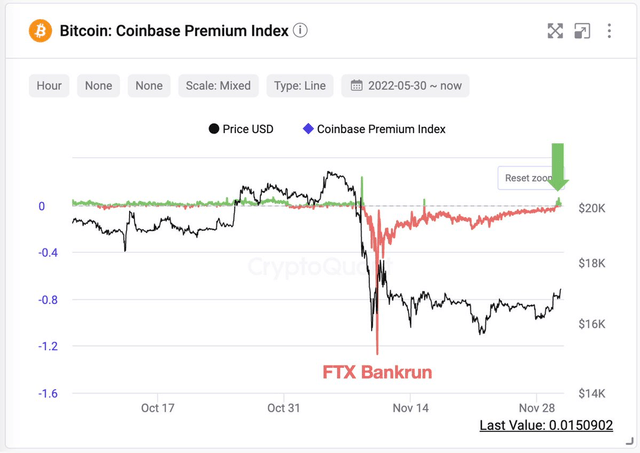 주기영 크립토퀀트 대표는 1일 자신의 트위터를 통해 "FTX 파산 이후 코인베이스의 시간 당 비트코인(BTC) 가격 프리미엄이 처음으로 양수 전환했다"며 이같이 밝혔다.