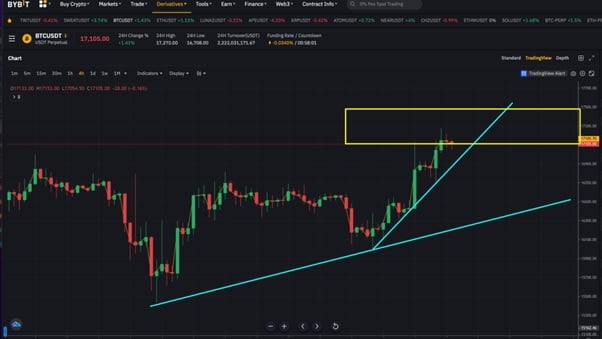 4시간봉 기준, 하늘색 상승 추세선을 만들어가며 1만7000달러 위를 지키고 있다. 금리 인상 완화 호재로 반등을 보이고 있지만, FTX 붕괴발 이슈가 아직 해결되지 않은 만큼 하락 포지션으로 쏠림을 방지하기 위한 인위적인 차트일 가능성도 존재한다. 상승 추세를 이어가기 위해서는 노란색 박스권 구간을 뚫고 안착해야 한다. 만약 다시 1만5000달러대로 하락을 보인다면 상승 추세는 다시 깨지고 매도 압력이 크게 작용할 수 있다.