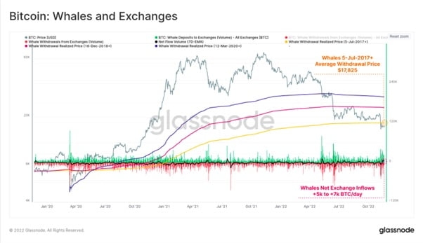 고래 (BTC 보유량이 1000개 이상인 지갑)들도 FTX 이후 신뢰가 떨어진 시장에서 조금씩 떨어져 나가는 것으로 나타나고 있다. 노란색 선은 2017년 이후 고래들이 인출한 평균 가격인데, 해당 가격이 최근 현물 가격보다 높은 것을 확인할 수 있다. 이는 고래들도 큰 손실 구간에 다다른 것을 의미한다.