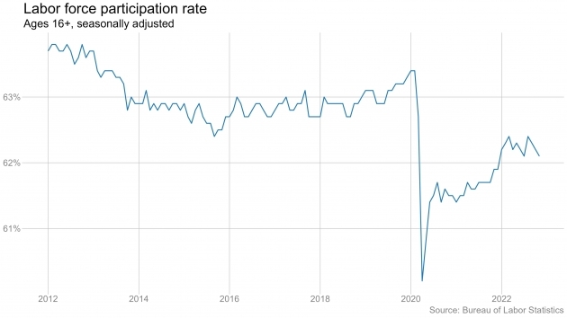 노동시장 참여율은 전달보다 0.1%포인트 줄어 62.1%로 하락했습니다. 노동시장에 진입하는 사람이 늘어나야 임금 상승 압력이 줄어들게 되는데, 두 달 연속으로 줄어든 것입니다. 이는 인플레이션 하락에는 나쁜 소식입니다. 실업률은 3.7%로 유지됐습니다. 예상이나 전달과 같습니다.