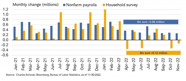 11월 신규고용은 26만3000개가 생겨나 예상 20만 개를 훨씬 웃돌았습니다. 뱅크오브아메리카에 따르면 Fed가 원하는 실업률의 완만한 상승이 이뤄지려면 신규고용이 10만 개 이하가 되어야 하고, 만약 경기 침체가 걱정되어 완화적으로 전환하려면 5만~7만 개까지 내려와야 합니다.