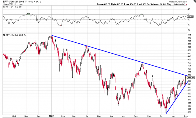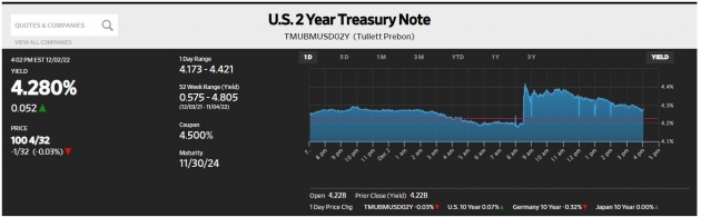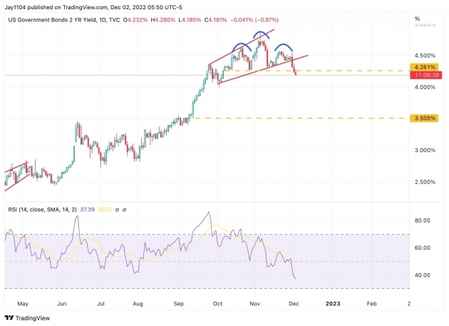 오늘 S&P500 지수는 장 초반 급락하다가 회복되어 4071.70으로 거래를 마쳤습니다. 여전히 200일 이동평균선을 지켰습니다. 이렇게 기술적 변곡점에 걸린 자산들이 너무 많습니다. 2년물 금리의 경우 11월 초 4.8%까지 치솟았다가 떨어지면서 '헤드 앤드 숄더' 패턴이 만들어졌습니다. 추가 하락을 예고하는 기술적 패턴입니다. 10년물도 기술적 저항선 3.5% 선을 깨고 내려갔습니다. ICE 달러 인덱스도 2021년 6월 이후 처음으로 200일 이동평균선(105선)을 깨고 내려가 이틀째 104선에 머물고 있습니다. 물론 이런 추세가 확인되려면 적어도 일주일 이상은 추세 이상이나 이하에 머물러야 할 것입니다.