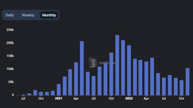 4일 디파이라마는 트위터를 통해 "11월 DEX 거래량은 1038억4000만 달러를 기록했다"며 "이는 지난 5월 이후 최고 높은 수치"라고 밝혔다.