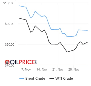11월 들어 국제유가는 부진한 흐름을 보였다. 중국의 코로나19 확진자가 급증하며 수요 둔화에 대한 우려가 커졌기 때문이다. 중국 국가위생건강위원회에 따르면 지난달 27일 중국의 신규 확진자 수는 3만8000명을 웃돌며 코로나19 확산 이후 역대 최대치를 기록했다. 유럽연합(EU) 회원국들이 일찍이 도입을 예고했던 러시아산 원유 가격상한제는 상한선에 대한 의견이 엇갈리며 도입에 난항을 겪었다.