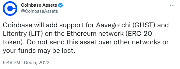 글로벌 가상자산(암호화폐) 코인베이스가 5일(현지시간) 트위터를 통해 아베고치(GHST), 릿엔트리(LIT)를 상장한다고 공지했다.
