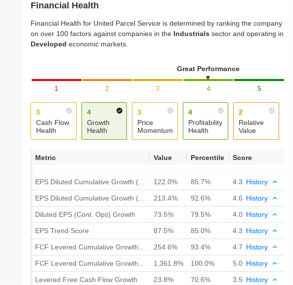 UPS는 뛰어난 택배 운영과 더 나은 비용 관리 덕분에 2019년부터 개당 매출이 23% 증가되었고, 이는 높은 수익으로 이어졌다. 또한 수익 마진 성장을 유지하기 위해서 내부적으로 분류 시설의 자동화 강화 등 더 많은 변화를 계획하고 있다. 뛰어난 실적 덕분에 UPS는 인베스팅프로 모델에서도 높은 재무건전성 점수를 받았다.