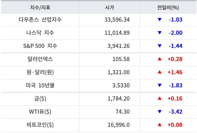 주요 기술주가 급락했다. 페이스북의 모회사인 메타는 회사의 타깃 광고 모델이 유럽 당국의 조사에 직면했다는 소식에 6.79% 하락 마감했다. 이외 애플 2.54%, 넷플릭스 2.25%, 엔비디아 3.75%, 알파벳 2.51% 하락했다.