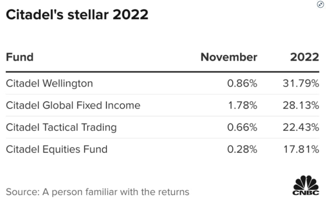 이날 CNBC는 시타델의 5가지 핵심 전략인 주식, 원자재, 채권, 퀀트, 신용 투자가 지난 달 모두 긍정적인 수익률을 기록했다고 밝혔다. 시타델이 관리하는 전술 트레이딩 펀드(Tactical Trading Fund)와 주식 펀드(Equities Fund)는 지난달 각각 0.66%, 0.28% 상승해, 올해 들어 22.43% 17.81%의 수익을 올리고 있다.