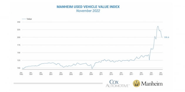 또 만하임 중고차 지수는 11월 199.4를 기록해 6개월 연속 하락했고 2021년 8월 이후 처음으로 200 아래로 떨어졌습니다. 만하임 지수를 발표하는 콕스 오토모티브는 이는 가격으로 따지면 10월보다 1.6% 하락한 것이고 1년 전보다 12.4% 내린 것으로 풀이했습니다.