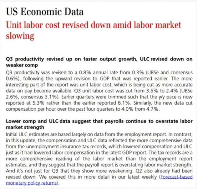 Fed가 더 강하게 긴축할 수 있다는 걱정은 여전합니다. 그리고 오늘 예상보다 낮게 나온 단위 노동비용을 놓고도 보는 시각이 엇갈립니다. UBS는 이렇게 노동비용이 둔화한 걸 보면 노동시장 둔화가 이미 진행되고 있다고 분석했습니다. 그러면서 11월 고용보고서에서 시간당 임금이 5% 넘게 오른 것은 과대평가된 것으로 봤습니다. 그래서 노동시장이 실제 둔화하고 있는 상태에서 Fed가 11월 고용보고서를 기반으로 지나친 긴축을 할 수 있다고 우려했습니다. 그러면 경기 침체 우려가 커지겠지요. 반면 JP모건은 "생산성 증가(3분기까지 연 -1.3%)는 이뤄지지 않고 있고, 노동비용(3분기까지 연 5.3%) 상승은 강하다"라면서 "여전히 빡빡한 노동시장이 임금 상승 압력을 가하고 있다"라고 분석했습니다. 해석은 다르지만 둘 다 결국 경기 침체 걱정으로 이어집니다.