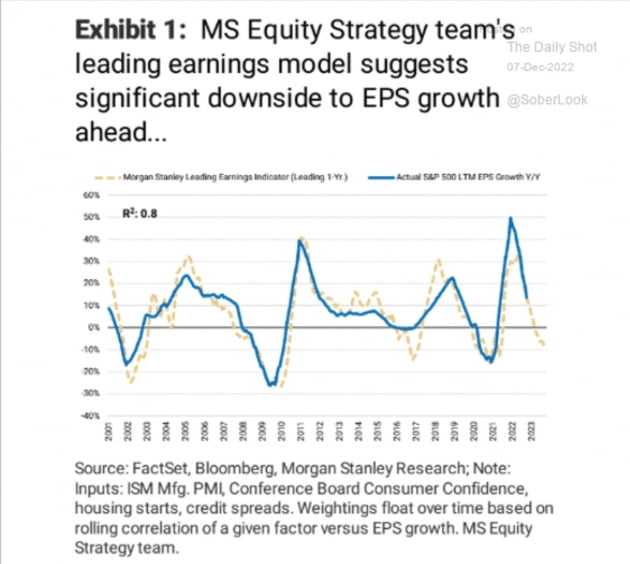 월가는 연말 산타 랠리가 있을지는 모르지만, 내년 초에는 주가가 하락하면서 새로운 바닥을 찾을 것으로 봅니다. 경기 둔화로 인해 주가의 펀더멘털인 기업 이익(EPS)이 본격적으로 감소할 것으로 보기 때문입니다. 모건스탠리는 내년 1월 중순에 시작되는 4분기 어닝시즌이 그 시발점이 될 것으로 봅니다. 모건스탠리 자산운용의 리샤 살럿 최고투자책임자(CIO)는 "인플레이션이 소비자의 구매력을 잠식함에 따라 내년에 주식 시장의 일부 대기업들의 실적이 예상보다 훨씬 큰 타격을 입을 수 있다. 이러한 전망이 현재 월가의 이익 추정치에 반영되지 않고 있으며 여러 차례 하향 조정에도 불구하고 너무 높은 수준을 유지하고 있다. 많은 기업이 주는 가이던스도 망상적이다. 나는 그런 높은 가이던스가 많은 사람에게 깜짝 놀랄 깨달음을 줄 것으로 생각한다"라고 말했습니다. 실제 그런 기업들이 늘어나고 있는 건 사실입니다.