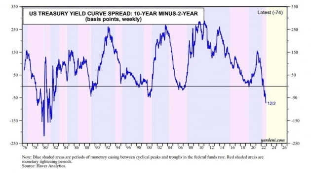 하지만 일부에선 이를 인플레이션 하락의 신호로 해석합니다. 에드 야데니 야데니 리서치 설립자는 "투자자들은 경제가 너무 강할 수도 있고 동시에 너무 약할 수도 있다는 점을 우려하고 있다"라며 "10년물과 2년물 국채 사이의 수익률 곡선 스프레드는 Fed의 통화정책 긴축 주기가 거의 끝났음을 시사한다. 경기 침체가 임박했거나 인플레이션이 경기 침체 없이 계속 하락할 가능성이 있기 때문"이라고 주장했습니다.