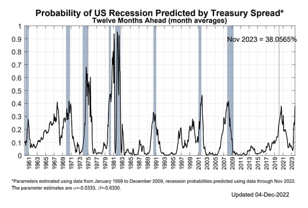 연준은 심지어 3개월물과 10년물 금리 곡선에 따라 경기 침체 가능성을 측정하는 추적기를 사이트에 두고 있다. 이에 따르면 이미 11월 말 금리 역전 수준은 12개월 이내에 38%의 경기 침체 가능성을 암시했다.