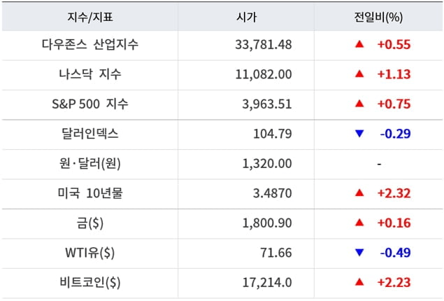 뉴욕증시는 7일(현지시간) 상승했다. 뉴욕증권거래소(NYSE)에서 다우지수는 전장보다 183.56포인트(0.55%) 오른 33,781.48을 기록하며 마감을 했다. S&P500지수는 전장보다 29.59포인트(0.75%) 상승한 3,963.51을, 기술주 중심의 나스닥지수는 전장보다 123.45포인트(1.13%) 뛴 11,082.00을 기록하며 장을 마쳤다.