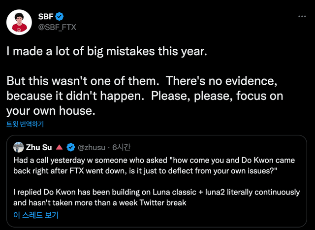 이에 SBF는 9일(현지시간) 자신의 트위터를 통해 "올해 큰 실수를 많이 저질렀다. 하지만 그의 주장은 사실이 아니다. 증거가 없다. 그런 일은 일어나지 않았으니까. 제발 당신의 일에 집중하길 바란다"고 대응했다.