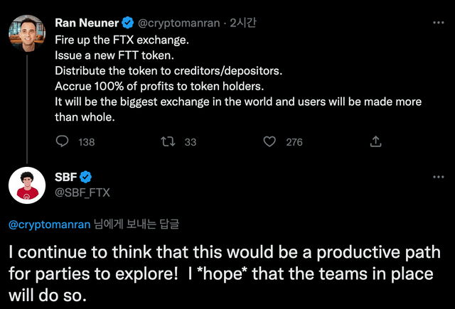 샘 뱅크먼 프리드(SBF) 전 FTX CEO는 FTX가 새로운 FTX토큰(FTT)를 발행해 채권자와 예금자에게 나눠줘야한다는 주장에 "생산적인 방식이 될 것"이라고 동의했다.