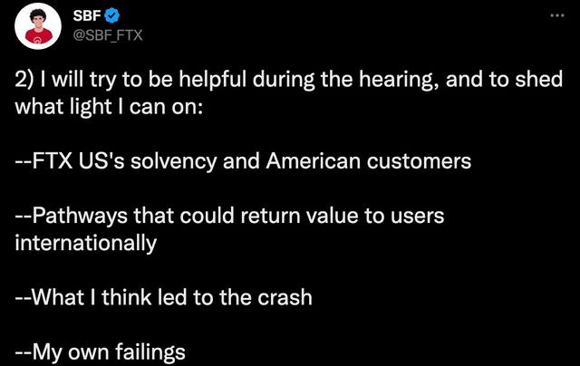 이어 "FTX US의 지급 능력과 미국 고객, 상환을 위한 경로, FTX 붕괴에 대한 내 생각 등을 밝힐 것"이라고 덧붙였다.