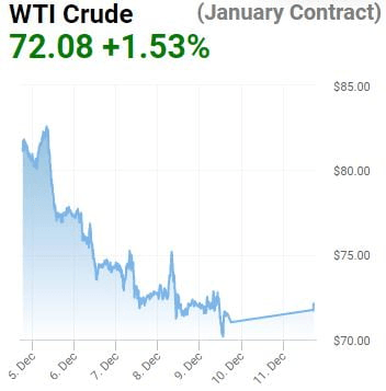 이날 오후 6시 기준으로 미 뉴욕상업거래소(NYMEX)에서 내년 1월물 서부텍사스원유(WTI)는 전 거래일보다 1.13달러(1.59%) 상승한 배럴당 72.11달러에 거래되고 있다. 전날 종가(배럴당 71.02달러)는 2021년 12월 20일 이후 최저 수준을 찍은 바 있다.