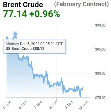 유가가 6거래일 연속 하락한 것도 2021년 8월 20일로 끝난 시점 이후 최장기간이다. 당시에는 7거래일 연속 하락했다. 이번 주부터 주요 7개국(G7)과 유럽연합(EU)의 러시아 원유 가격상한제가 시행됐으며, EU와 영국 등의 러시아산 원유 수입 금지 조치도 시행했다.