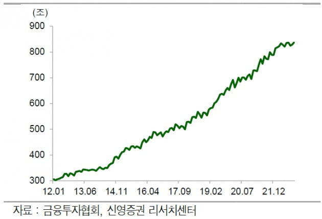 오광영 신영증권 연구원은 '2022년 펀드시장과 2023년 전망' 보고서를 내고 "올해 국내 펀드시장 전체 설정액은 총 49조2957억원 증가해 837조7000억원을 기록, 전년 말 대비 6.3% 성장했다"고 했다. 다만 이 성장률은 작년 연간 성장률의 13.4%에 비해 절반도 안 되는 수준이고 2018년 이후 최저 수준이다. 같은 기간(1월~11월) 기준으로는 2012년 이후 최저 수준이다.