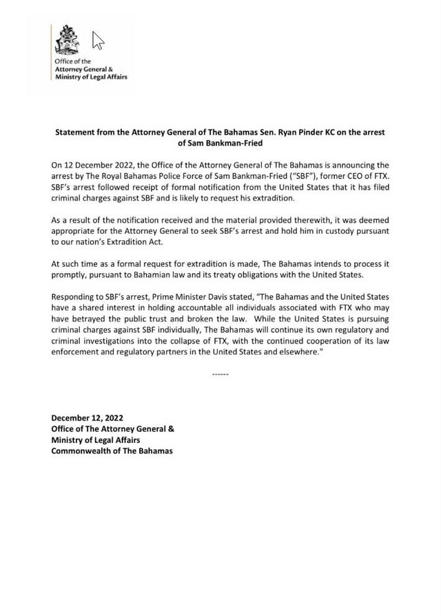라이언 핀더(Ryan Pinder) 바하마 법무장관은 성명을 통해 "(미국의 형사 고발) 통지와 함께 제공된 자료를 검토한 결과, SBF를 체포하고 우리나라 범죄인 인도법에 따라 구금하는 것이 적절하다고 판단했다"고 밝혔다.