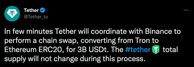13일(현지시간) 테더는 공식 트위터를 통해 "바이낸스와 협력해 30억USDT를 TRC20에서 ERC20으로 스왑할 예정이라고 밝혔다.