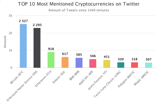 4위~10위에는 솔라나(SOL, 617회), 바이낸스코인(BNB, 585회), 에이프코인(APE, 506회), 연파이낸스(YFI, 451회), 테라 루나 클래식(LUNC, 320회), 폴리곤(MATIC, 318회), 매직(MAGIC, 307회) 등이 이름을 올렸다.