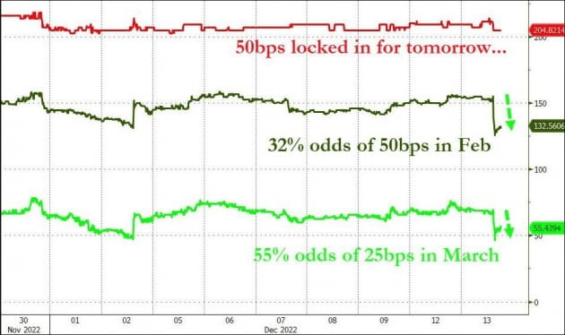 골드만삭스는 "우리는 이제 내일 점도표에서 나타날 2023년 최종금리 중앙값이 기존 예상인 5~5.25%와 그보다 작은 4.75~5% 사이 사이에서 결정될 것으로 본다"라고 밝혔습니다. 어제까지 5~5.25%가 될 것으로 봤는데, 그보다 낮아질 가능성을 제기한 것이죠. 웰스파고는 "FOMC가 내일 50bp를 올릴 것으로 기대하지만, 2023년 첫 회의에서 또다시 25bp 인상으로 금리 인상 폭을 추가 하향할 가능성이 커졌다"라고 주장했습니다. 제프리스는 "오늘 CPI 보고서가 내일 Fed의 결정을 바꾸지는 못하겠지만 내부 비둘기파들이 가능한 한 빨리 25bp로 인상 속도를 늦추기 위해 더 강력히 밀어붙이는 것을 볼 수 있을 것"이라고 지적했습니다.