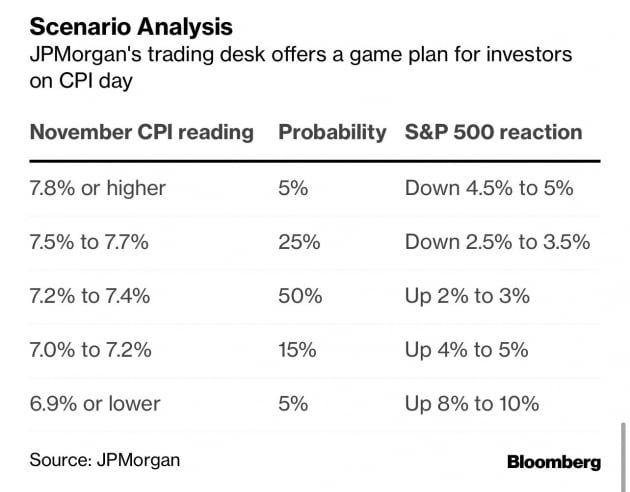 JP모건은 어제 아침 CPI가 7.0~7.2%(확률 15%)로 나오면 S&P500 지수가 4~5% 오를 것으로 예측했습니다. 이 보고서가 나온 뒤 어제 S&P500 지수는 1.43% 올랐고, 오늘 한때 2.72%까지 상승했습니다. 합쳐서 거의 4% 오른 뒤 상승 폭이 꺾어진 것입니다. 월가 관계자는 "'소문에 사고 뉴스에 팔라'라는 월가 격언을 확인시켜주는 전형적 트레이드"라면서 "어제부터 매수해서 이익을 챙긴 트레이더 일부가 차익을 실현한 것으로 본다"라고 말했습니다.