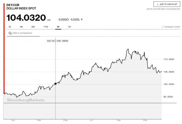 만약 Fed가 금세 돌아선다면 잡혀가던 인플레이션은 다시 날개를 펼칠 수 있습니다. 금융여건이 급속히 개선되면서 돈이 다시 풀릴 터이니까요. 오늘 채권 시장에서 오후 4시께 미 국채 10년물 금리는 9.3bp 내린 3.521%, 2년물은 16.4bp나 내린 4.231%에 거래됐습니다. 달러 가치는 급락했습니다. ICE 달러인덱스는 1.05%나 내려 104.03으로 마감됐습니다. 한때 103.55까지 내려 6월 이후 최저를 기록했습니다. ING의 패드릭 가비 리서치 헤드는 "만약 Fed가 내일 비둘기파적으로 전환한다면 금융여건은 대폭 완화될 것이고 그동안 실시해온 긴축의 효과를 사라지게 할 것"이라고 설명했습니다.