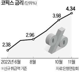 코픽스는 국내 8개 시중은행이 조달한 자금의 평균 금리다. 은행이 실제 취급한 예·적금과 은행채 등의 금리가 반영된다. 예·적금 금리 반영 비중이 80%가량으로 가장 높다. 한국은행이 지난달 기준금리를 연 3.0%에서 연 3.25%로 올린 이후 은행들이 연 5% 안팎의 고금리 예·적금 상품을 잇달아 출시하면서 자금조달 비용이 늘어난 게 영향을 미쳤다는 분석이다.