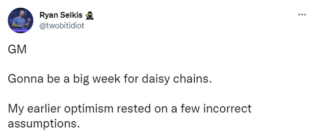 가상자산(암호화폐) 데이터 분석 업체 메사리의 라이언 셀키스(Ryan Selkis) 창업자가 15일(현지시간) 자신의 트위터를 통해 "이번 주는 데이지 체인(인위적으로 토큰 가격을 올린 뒤 수익을 남기고 덤핑하는 부도덕한 거래 집단) 프로젝트들엔 힘든 한 주가 될 것"이라고 밝혔다.