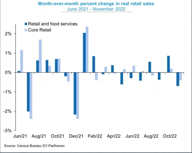 하지만 최대 쇼핑시즌인 '블랙 프라이데이'가 포함된 11월에 이렇게 악화할 줄은 몰랐습니다. 아마존 등 온라인 전자상거래 기업들이 역대급 할인 행사를 벌였음에도 온라인 판매 역시 전월보다 0.9% 줄었습니다(할인 효과, 즉 가격 변동을 통제해도 0.3% 감소함). 자동차, 휘발유, 식품 서비스 및 건축자재 등과 같은 변동성이 큰 항목을 뺀 '통제 그룹'도 전월 대비 0.2% 감소했습니다. BMO캐피탈마켓의 살 과티에리 이코노미스트는 "11월에도 소비가 이어지지 않은 건 소비자들이 침체 우려와 고금리·고물가에 따른 여파를 느끼며 지출에 훨씬 조심스러워졌다는 의미"라고 말했습니다. ING는 "Fed가 인플레이션을 낮추기 위한 전투에 집중하면서 75bp 추가 인상을 예고하는 환경에서 이런 소매 판매 수치는 경기 침체에 대한 시장의 우려를 높일 것"이라고 분석했습니다.