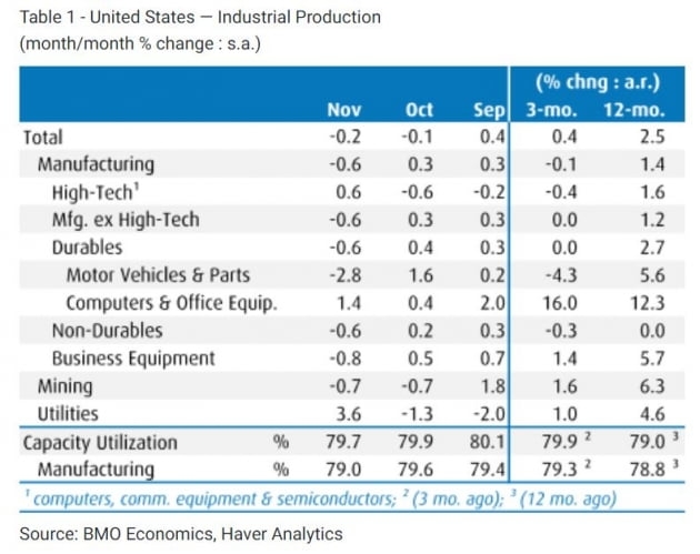 11월 산업생산은 전월보다 0.2% 줄어 예상치인 0.1% 증가보다 부진했습니다. 지난 6개월 동안 네 번째 감소세입니다. 가장 큰 비중을 차지하는 제조업이 지난 6월 이래 처음으로 감소(-0.6%)한 게 부정적 영향을 미쳤습니다. BMO는 "소비자들이 계속해서 지출을 상품에서 서비스로 되돌리고, 더 높은 금리의 영향이 경제에 전달됨에 따라 앞으로 몇 달 동안 산업생산은 점점 더 압박을 받게 될 것으로 예상한다"라고 설명했습니다.