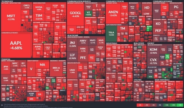 오전 9시 30분 0.5~1.3% 수준의 내림세로 출발한 주요 지수는 하락 폭을 계속 확대했습니다. 결국, 다우는 2.25%, S&P500 지수는 2.49% 떨어졌고 나스닥은 3.23% 하락한 채 거래를 마쳤습니다. 그것도 저점(다우 2.8%, S&P500 2.9%, 나스닥 3.54%)에서 소폭 회복한 것입니다. UBS자산운용의 나디아 로벨 전략가는 블룸버그TV 인터뷰에서 "오늘 시장 후퇴는 놀랍지 않다. 그동안 시장은 Fed가 그들이 하겠다고 말한 걸 하지 않을 것이라는 희망 속에 상승했다. 그런데 Fed는 어제 분명히 다른 메시지를 보냈다"라고 말했습니다. 그는 "경기 침체가 이미 주가에 반영되었다고 생각하지 않으며 2023년 상반기에 성장 둔화를 반영해 가격이 다시 책정될 것으로 예상한다"라고 덧붙였습니다.