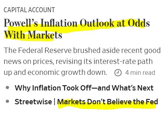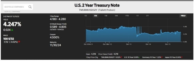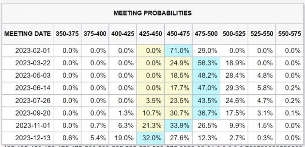2년물 금리에서 보듯 어제 FOMC 이후 시장과 Fed의 간격은 커졌습니다. 시카고상품거래소(CME) Fed 워치 시장을 보면 2월에 25bp, 3월에 25bp를 올린 뒤 금리 인상을 끝낼 것으로 봅니다. 그런 베팅이 50%에 달합니다. 최종금리 4.75~5%를 보고 있는 것이죠. Fed가 점도표에서 제시한 5~5.25%까지 오를 것이란 베팅은 20%대에 그칩니다. 파월 의장이 내년에는 금리 인하가 없다는 뜻을 여러 차례 밝혔는데도 내년 하반기 두 차례(50bp) 인하를 예상합니다. 뱅크오브아메리카의 마크 카바나 채권 전략가는 "시장은 Fed가 원하는 대로 '높은 금리를 오래 유지하겠다'(higher for longer)라고 말할 수는 있지만, '우리는 믿지 않겠다'라고 말하고 있다. 시장은 Fed가 금리 인상을 중단하는 순간 6~9개월 뒤 인하를 시작할 것으로 믿는다"라고 설명했습니다. 씨티그룹은 '시장에 도달하는 데 실패한 매파적 메시지'(Fed failed to drive a tougher tone on policy)라고 지적했습니다.
