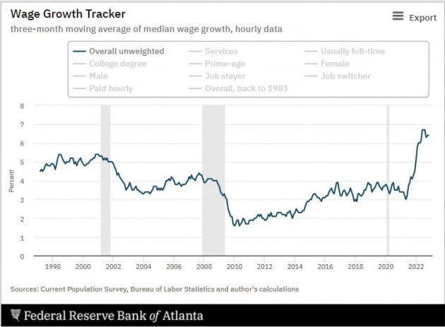 사실 오늘 좋지 않게 나온 소매 판매와 산업생산, 제조업 지수 등은 모두 상품 관련 지표입니다. 하지만 Fed는 보는 곳은 상품이 아닙니다. 서비스물가, 그리고 그걸 높이는 빡빡한 노동시장입니다. 오늘 실업 급여 청구 건수에서 보듯 노동시장과 임금 상승세는 여전히 강합니다. 애틀랜타 연방은행이 추산하는 임금 상승률(wage growth tracker)은 6.4%에 달합니다.
