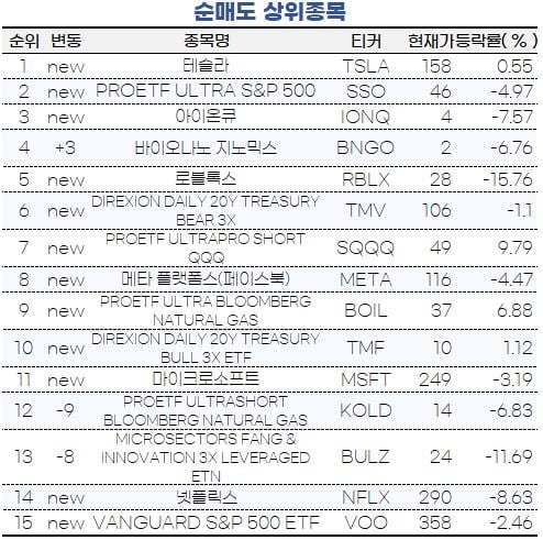 테슬라 외에도 고수들의 순매도 규모 상위에는 한국인이 설립한 걸로 유명한 양자컴퓨터 기업 아이온큐(3위), 최근 급등락세를 보인 진단기업 바이오나노 지노믹스(4위), 메타버스 기업 로블록스(5위) 등 성장주가 대거 자리했다.