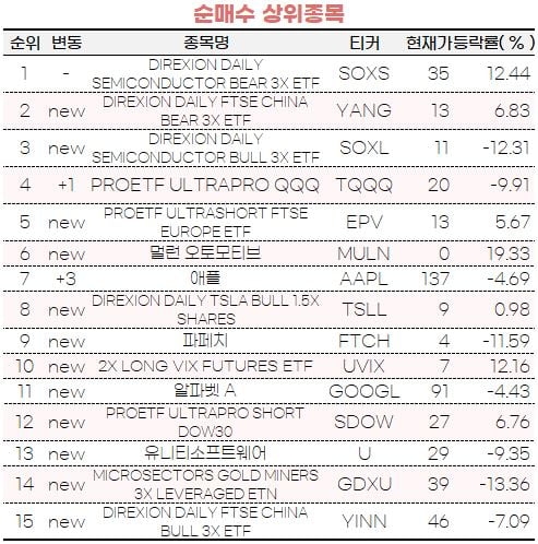 다만 최근 강세를 보이기도 했던 반도체 업종에 대한 태도는 엇갈렸다. 필라델피아반도체지수 등락의 3배를 역으로 추종하는 '디렉시온 데일리 세미콘덕터 베어 3X ETF(SOXS)'를 가장 많이 사들이면서 약세에 베팅하는 모습을 보였지만, SOXS와 가격이 반대로 움직이는 '디렉시온 데일리 세미콘덕터 불 3X ETF(SOXL)'도 세 번째로 많이 순매수했다.