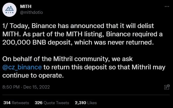 최근 글로벌 가상자산(암호화폐) 거래소 바이낸스(Binance)에서 상장 폐지당한 대만 유명 음악가 제프 황(Jeff Huang)의 미스릴(MYTH) 프로젝트가 상장 보험 예치 물량 20만BNB를 바이낸스에 요구한 것으로 나타났다.